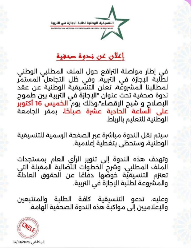 وتهدف هذه الندوة إلى تنوير الرأي العام بمستجدات الملف المطلبي وشرح الخطوات النضالية المقبلة التي تعتزم التنسيقية خوضها دفاعًا عن الحقوق العادلة والمشروعة لطلبة الإجازة في التربية.
