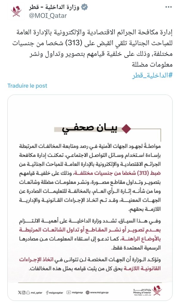 وأفادت وزارة الداخلية القطرية في بيان “تمكنت إدارة مكافحة الجرائم الاقتصادية والإلكترونية بالإدارة العامة للمباحث الجنائية من ضبط 313 شخصا من جنسيات مختلفة، وذلك على خلفية قيامهم بتصوير وتداول مقاطع مصورة، ونشر معلومات مضللة وشائعات وما من شأنه إثارة الرأي العام”.
