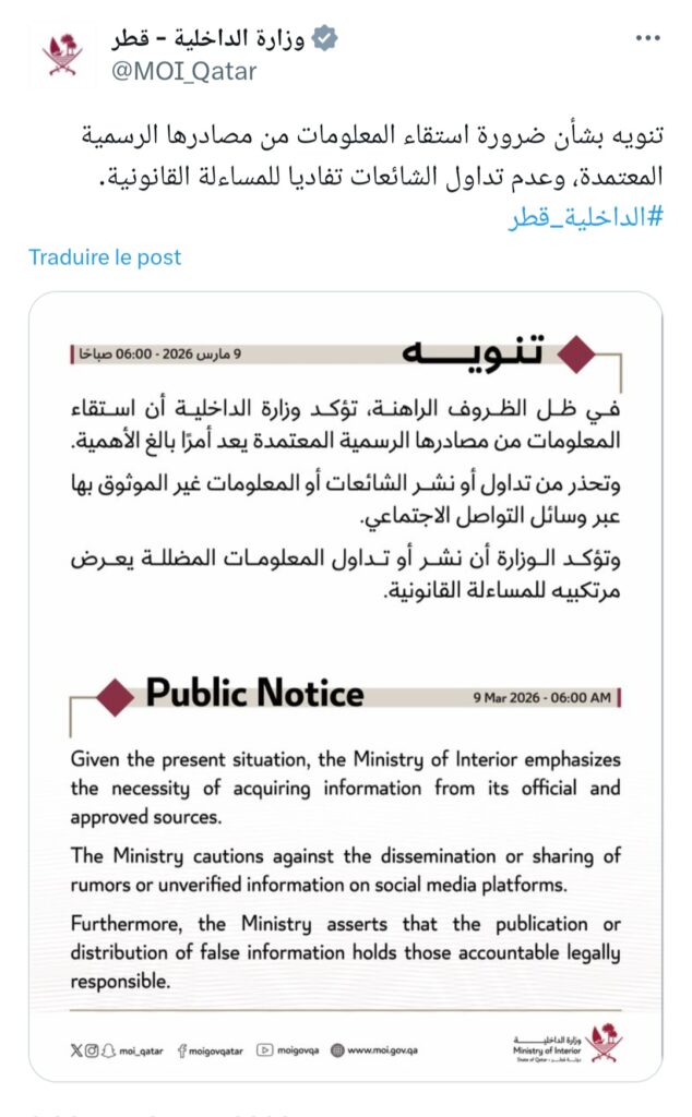 وشددت الوزارة على “الالتزام بعدم تصوير أو نشر المقاطع أو تداول الشائعات المرتبطة بالأوضاع الراهنة”، ودعت إلى “استقاء المعلومات من مصادرها الرسمية المعتمدة فقط”.